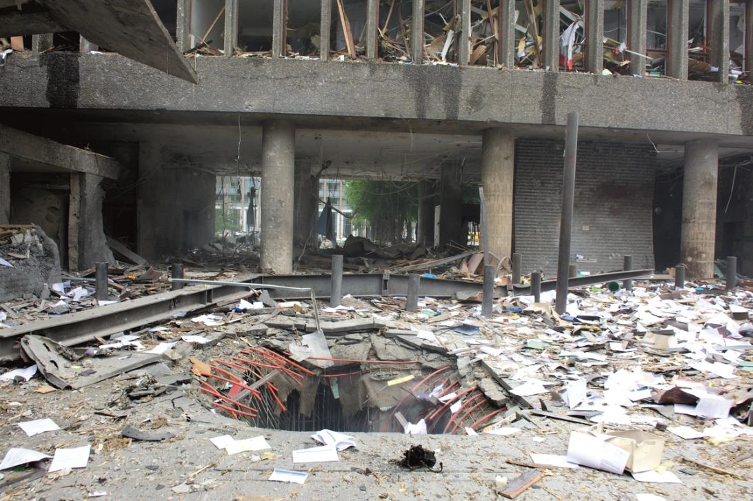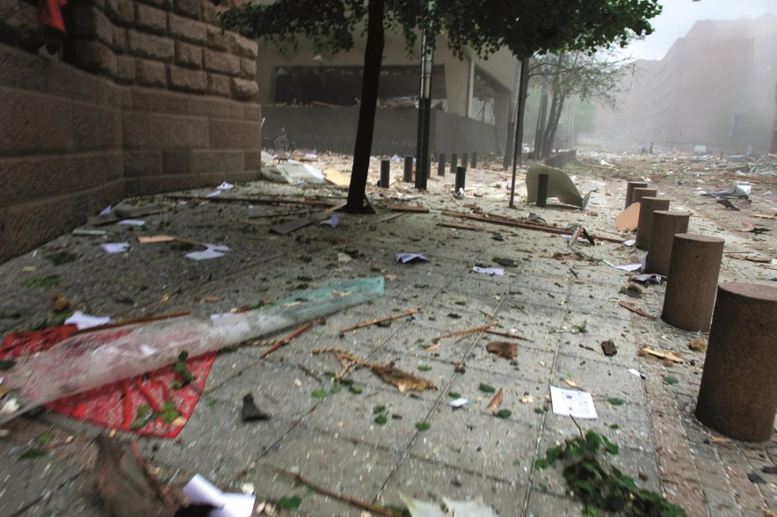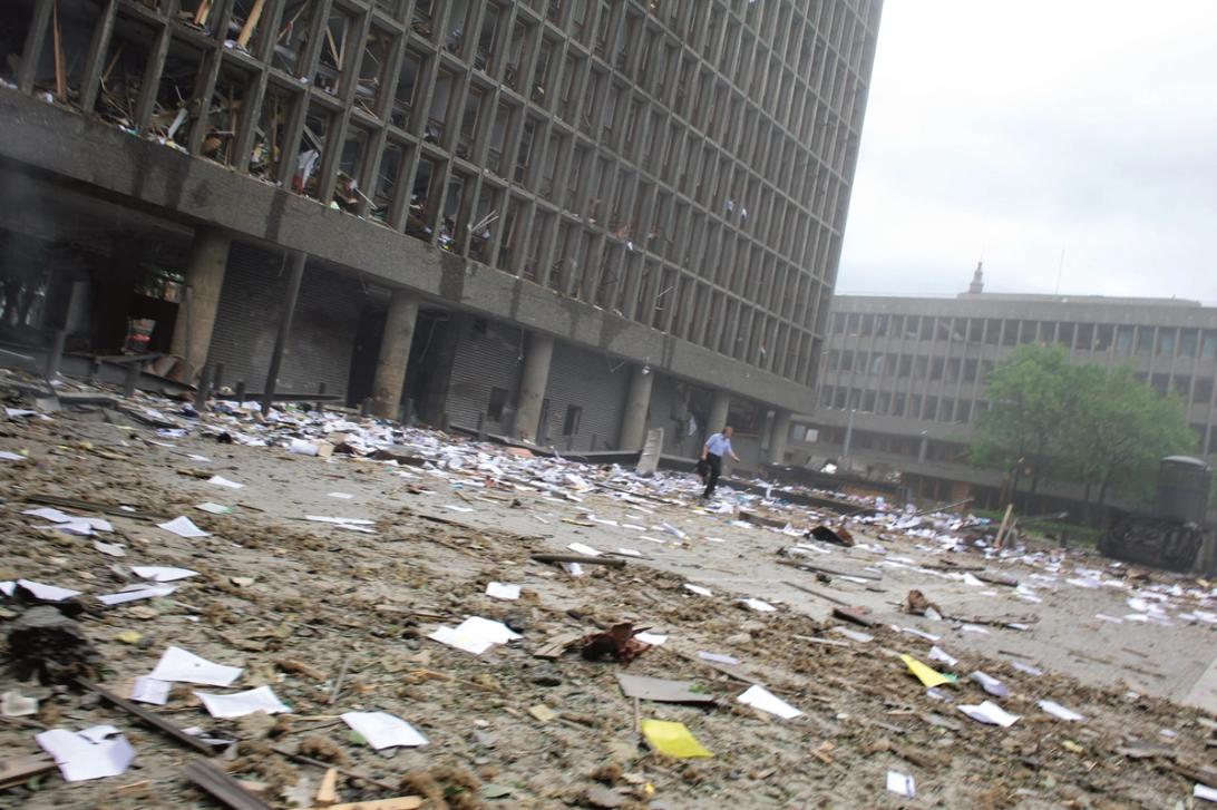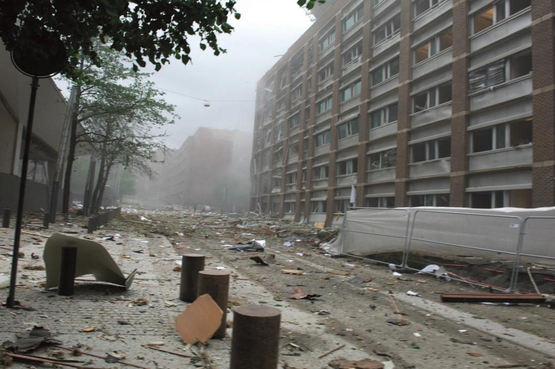 En bilbombe eksploderer. Åtte mennesker som befinner seg i eller i nærheten av Høyblokka blir drept.